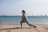 Woman in sports outfit doing lunge exercise on sandy beach with sea and boats background for outdoor fitness and healthy lifestyle concept.