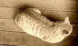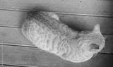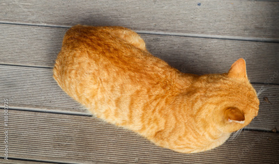 Orange tabbly cat lying down - top view - lying on grey boards with whiskers showing