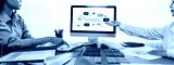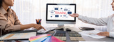 Group of interior architect designer team at table choosing various mood board samples with architecture software on laptop screen. Modern renovation and interior material selection concept. Insight