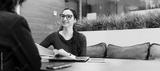 Female professional with long dark hair and glasses is engaged in a conversation at a modern office table with greenery in the background during a business meeting