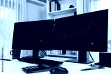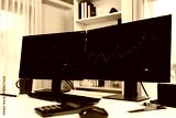 Two screens of dynamic stock market exchange graph showing on computer. Automatically trading sell or buy profit on time application investment on financial technology updated on software. Infobahn.