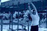 A woman is her arms above her head as she warms up for her workout at an outdoor gym.