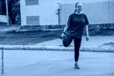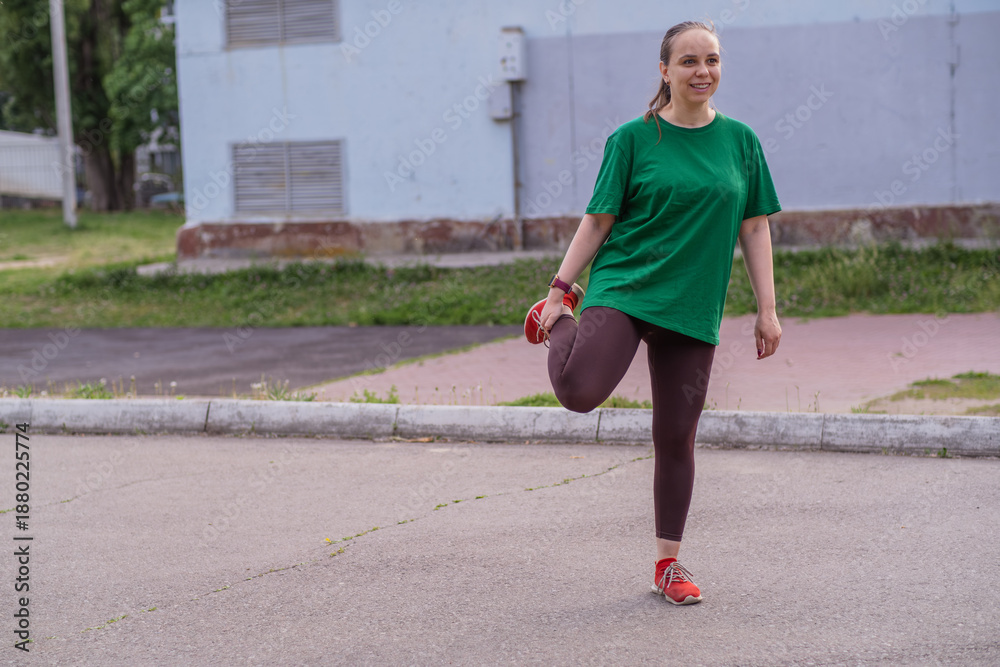 Young woman stretching in a green shirt during outdoor workout
