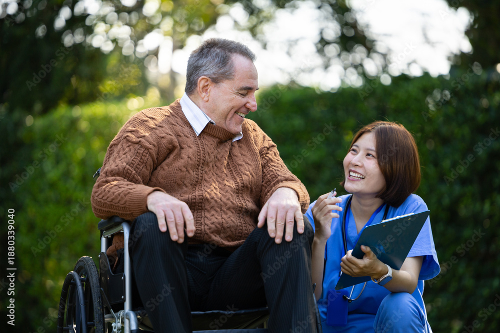 Caregiver Assisting Elderly Man in Wheelchair Outdoors