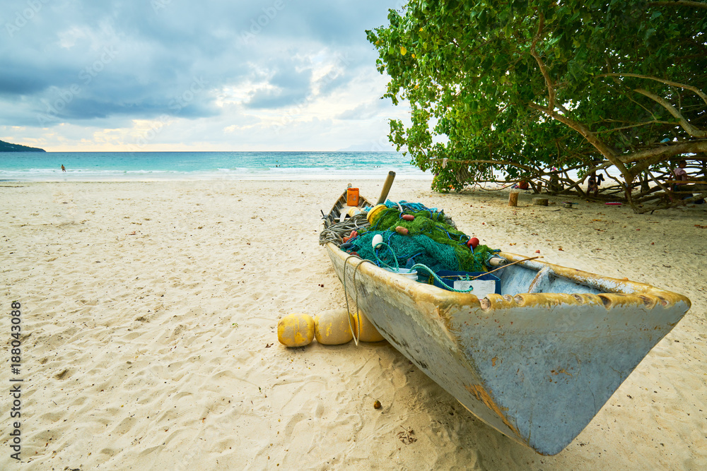 fishing boat with all equipment for fishing on the beau vallon beach, seychelles , mahe island