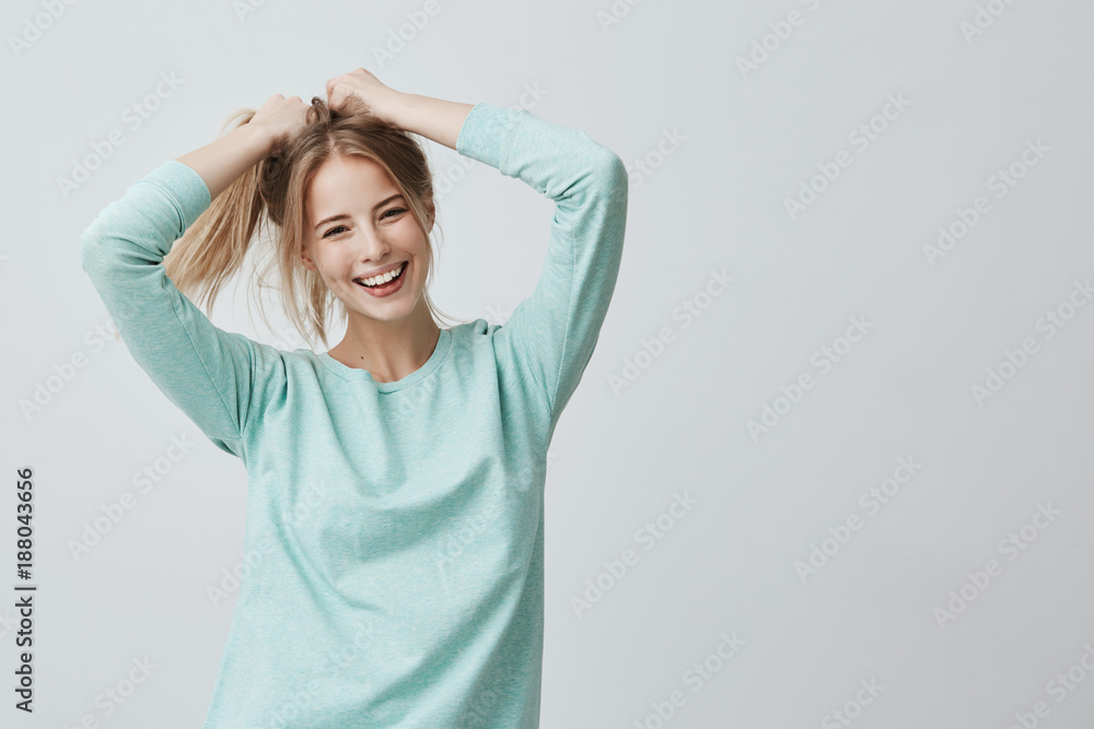 Human face expressions and emotions. Positive young beautiful female with dyed blonde straight hair in ponytail dressed in casual clothing looking at camera and pleasantly smiling, rejoicing life