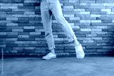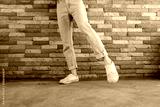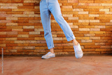 Old White Shoes. Woman Wear White Sneaker and Blue Jeans on Orange Brick Wall Background Great for Any Use.