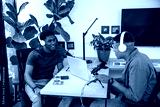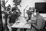 Diverse male colleagues sitting at office desk recording podcast using headphones and tripod mic
