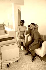 Diverse couple sitting on cream armchairs unpacking boxes on coffee table in modern living room