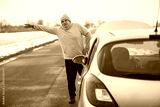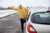 Man in yellow hoodie signals for help beside a broken-down car on a rural road during winter