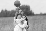 Mother and daughter enjoy a playful moment in a green field with a red balloon on a cloudy day
