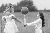 Woman and girl sharing a joyful moment with a red balloon in a grassy field during a cloudy day