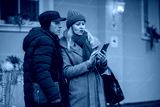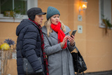 Two women checking a smartphone while bundled up in warm winter clothing outdoors in a city
