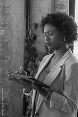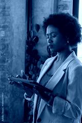 African american woman standing in office near brick wall interacting with tablet using stylus
