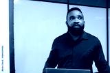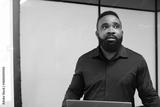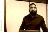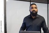 Man in shirt presenting on whiteboard with laptop in conference room, copy space