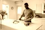 African american man tipping peppers off board into bowl at kitchen island, copy space