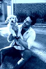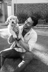 Man sitting in backyard lawn holding golden retriever puppy with collar with tennis ball