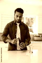 Man opening green glass bottle in home kitchen on island using metal opener near planter