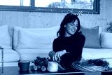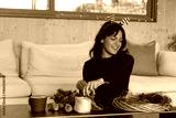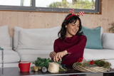 Woman wearing sweater, candy-cane headband assembling wreath with pine sprigs and twine at home