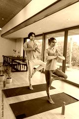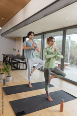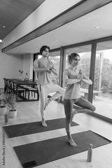 Couple practicing tree pose on yoga mats in modern home living space with water bottles, smartphone