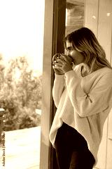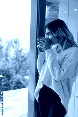 Woman holding ceramic mug with hands and sipping inside home beside sliding glass door, copy space