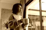 Senior Asian woman wearing mustard sweater holding ribbed mug gazing outside at sliding glass door