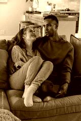 Diverse couple leaning together on sofa in living room by kitchen island with bar stools