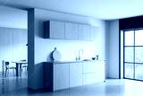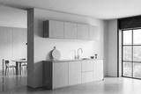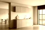 Minimalist light wood kitchen interior design with modern cabinets and natural lighting concept in elegant architectural background setting. 3D Rendering