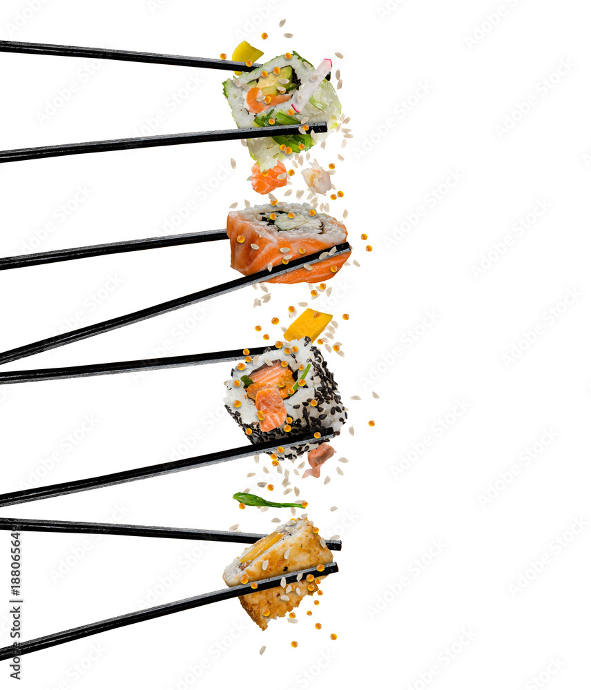 Pieces of sushi with wooden chopsticks, separated on white background.