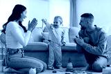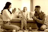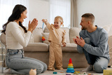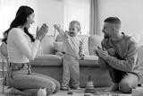 Parents Baby Interaction. Loving parent playing with toddler daughter in living room, mother and father spending time with little child