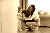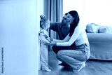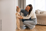 Kids Growth Progress. Loving parents fixing height of sweet little daughter child, setting hand on wall over kids head