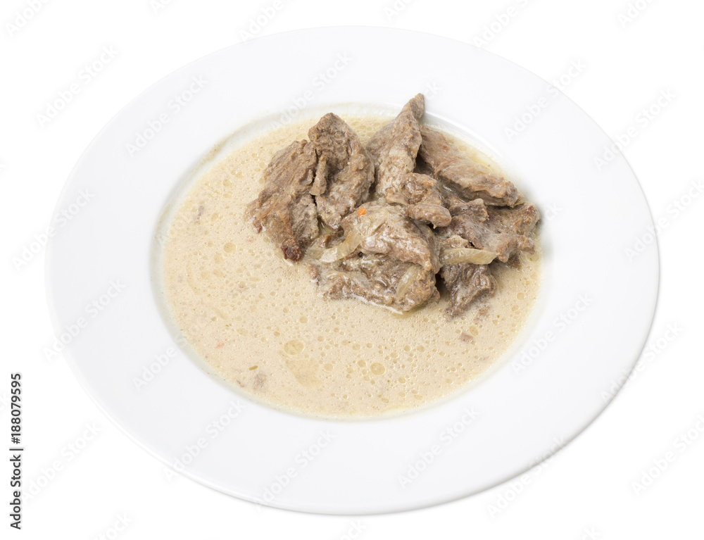 Sliced beef with white sauce.