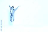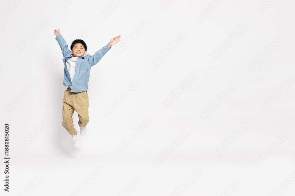 An energetic young Asian boy in a denim shirt and khaki pants jumps with joy against a white backdrop, symbolizing freedom and happiness, with ample copy space for creative marketing designs