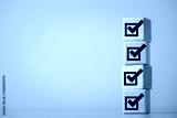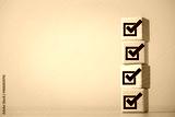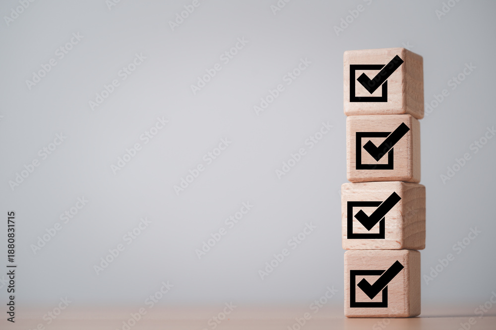 Stack of wooden blocks with check mark icons representing completed checklist, approval process of quality control, task management and audit compliance concept.