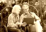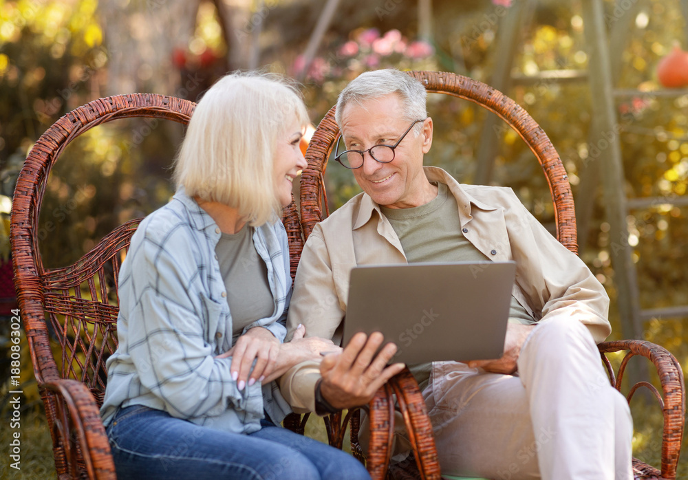 Happy elderly couple relaxing in wicker chairs in open air and using laptop computer, surfing internet or having video call online, copy space