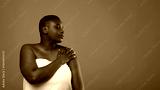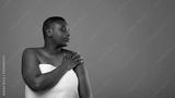 Bodycare Concept. Portrait Of Young Black Woman With Perfect Skin And Closed Eyes Hugging Herself , Touching Shoulder, Posing Isolated Over Brown Background, Turning Aside At Free Copy Space, Panorama