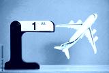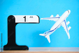 Flip calendar with date July 1 and flying plane on blue background symbolizes travel plans and new beginnings.