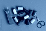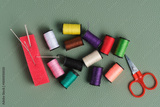 Spools of thread, scissors and needle on green background.