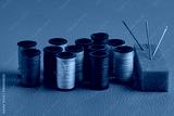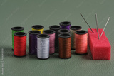 Spools of thread and needles on green background, sewing concept.