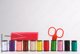 Spools of thread, scissors and needle on white background.