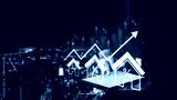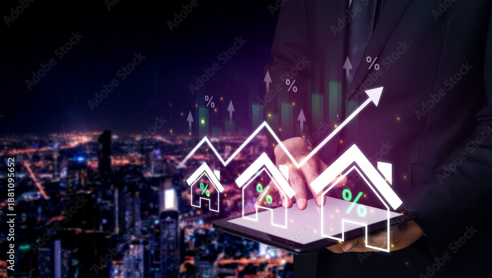 Concept of real estate investment and a rising housing market. The increase in property value is shown by growing mortgage rates, prices, and overall market appreciation. Fermion