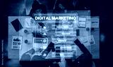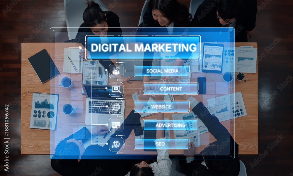 A dynamic overhead view of a business team engaged in digital marketing discussions, utilizing technology and analyzing data in a modern office space. Trope
