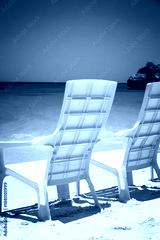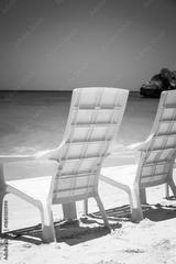 White plastic beach chairs neatly arranged looking at a beautiful, tropical turquoise sea. Paradise vacation on a deserted island. Island lifestyle.