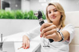 Female healthcare professional holding an otoscope in a modern office setting with greenery in the background, laptop and notepad visible on the desk during a consultation