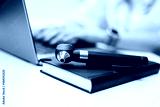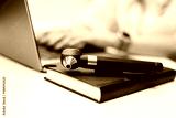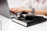 Black pen resting on a closed notebook beside a laptop with a blurred hand typing in the background, showcasing a workspace setup with modern office elements