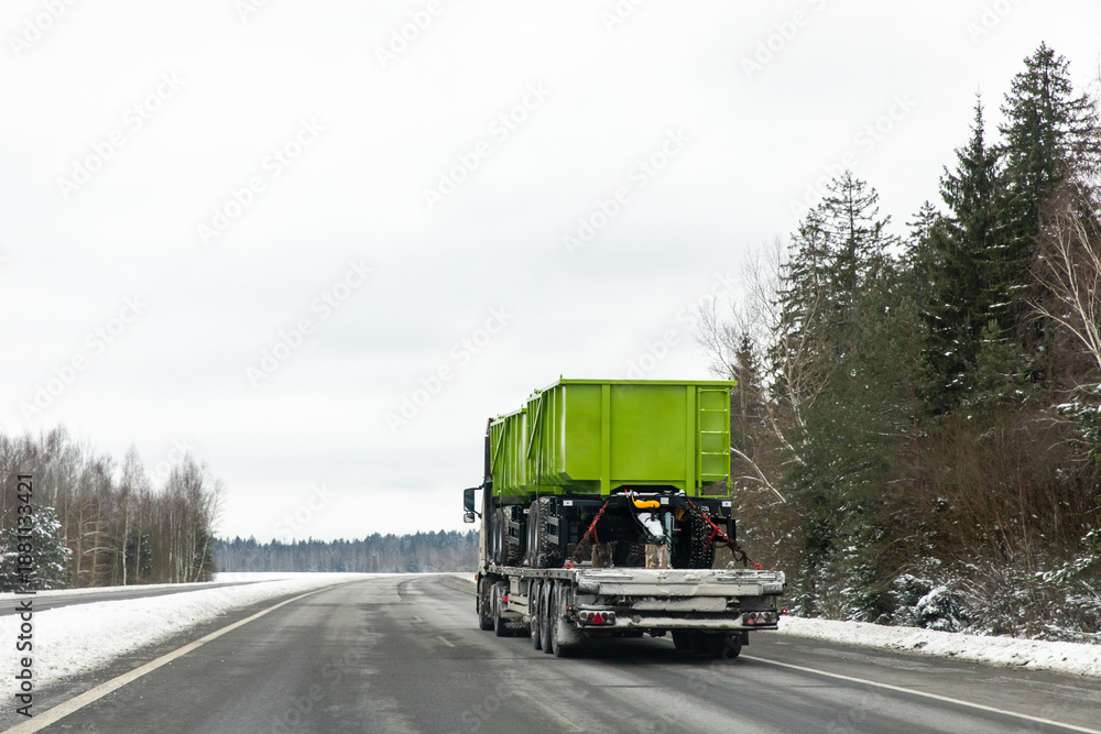 A tow truck transports two new green trailer for trucks along a highway. Heavy-duty transport and service machinery delivery concept. Logistics cargo transport