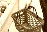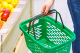 Women holding empty green shopping basket near fruits window in the supermarket. Shopping concept