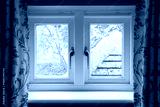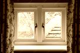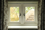 Window view from inside a home looking out to trees and a building roof, creating a feeling of domestic comfort