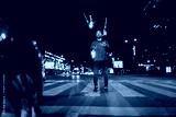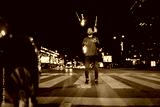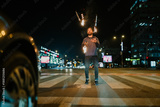 Man fire juggling on city street at night