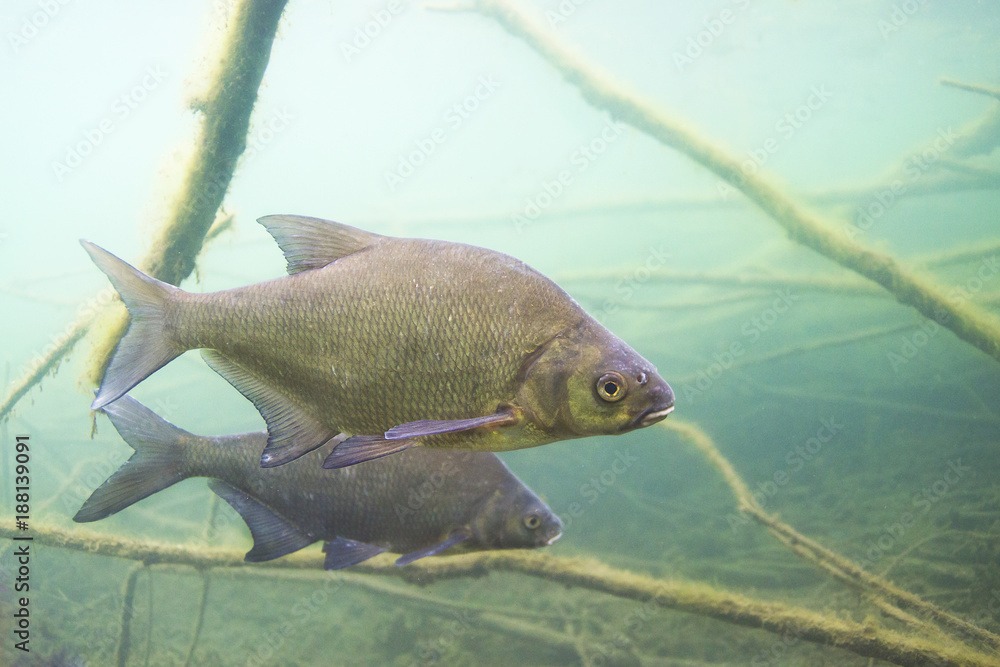 Underwater photography of Carp bream (Abramis Brama). Beautiful fish in close up photo. Underwater photography in the wild nature. River habitat. Swimming Common Bream in the clear pond.